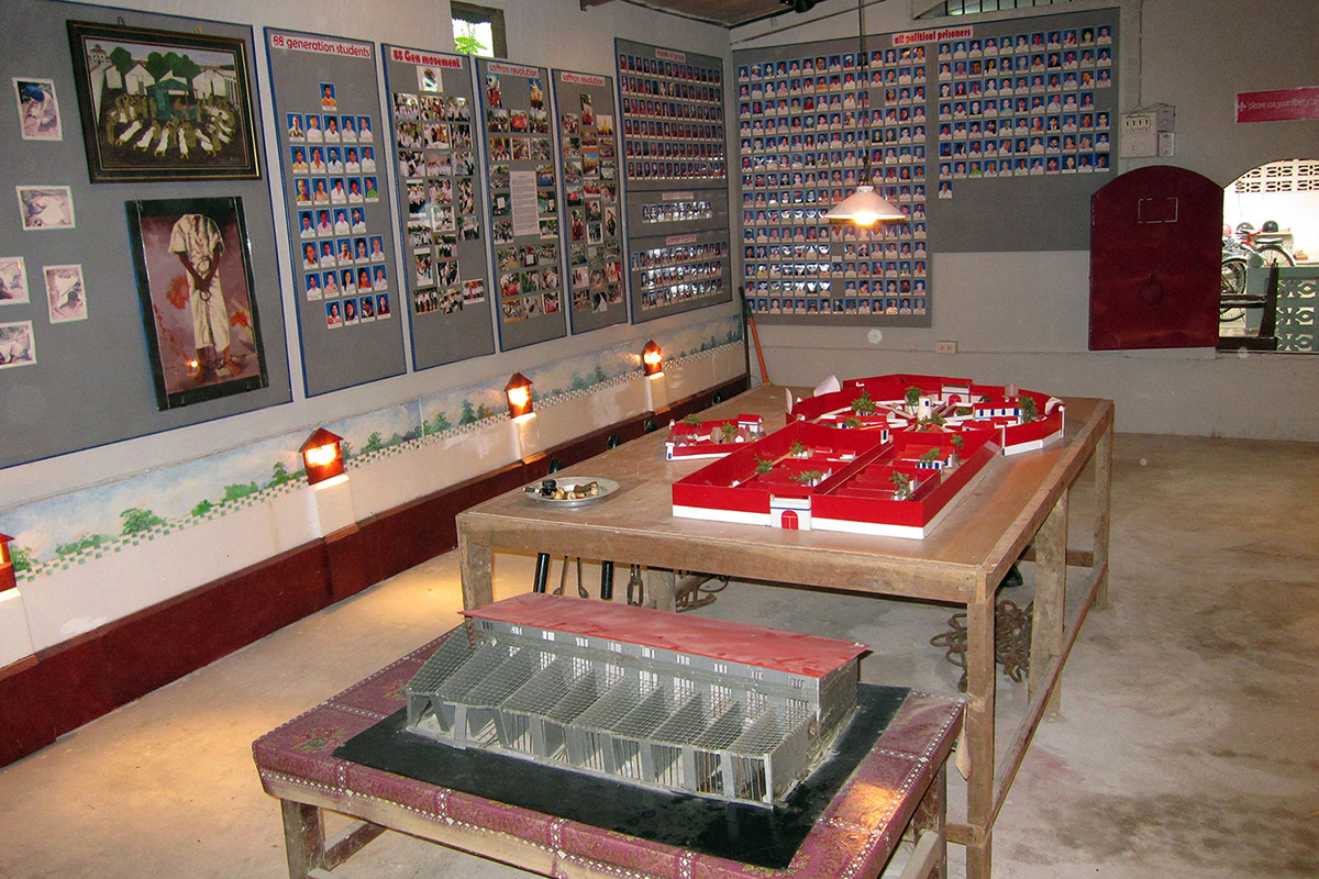 The masked dancer in from Ladakh in the Indian Himalayas while the room with table displays and wall photographs was shot in the Thai-Burma border town of Mae Sot at the office of Myanmar’s AAPP (Assistance Association for Political Prisoners. This is the AAPP’s museum and the red model on the table is a mockup of the infamous Insein Prison near Yangon.